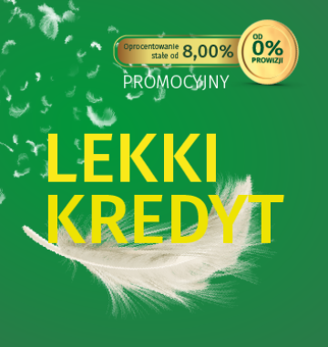 Baner z napisem Lekki Kredyt. Oprocentowanie stałe od 8,00 %. Od 0 % prowizji.